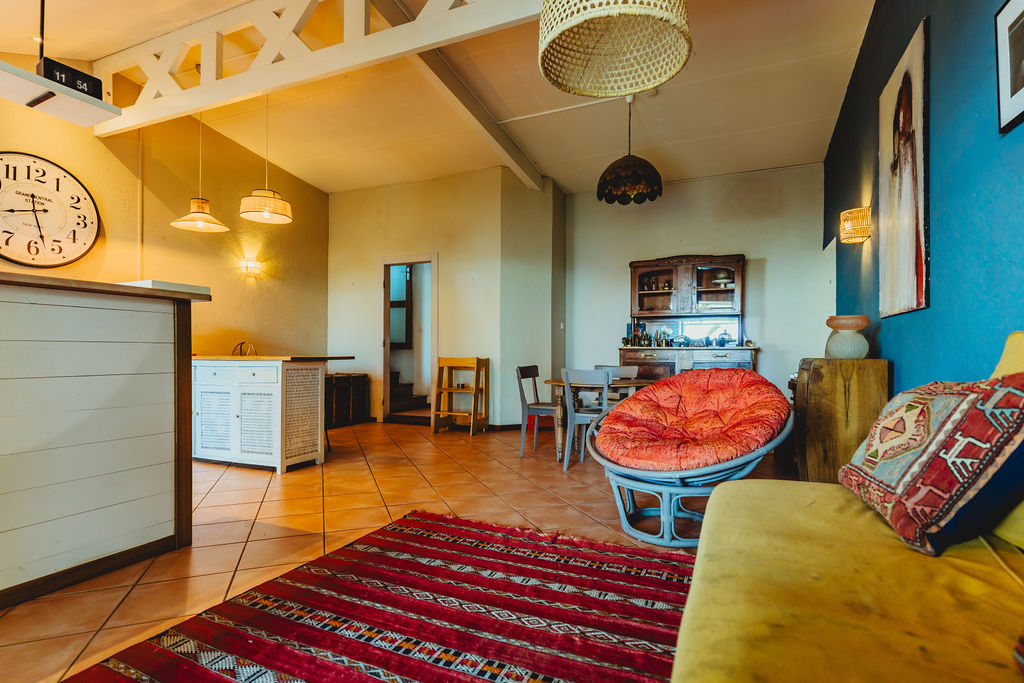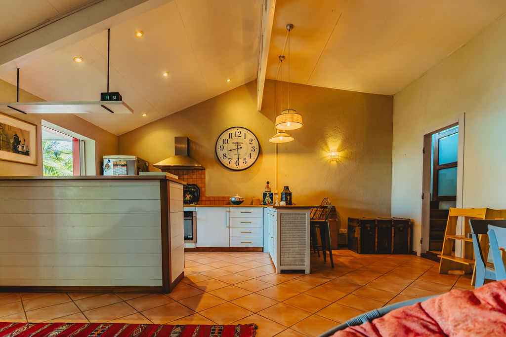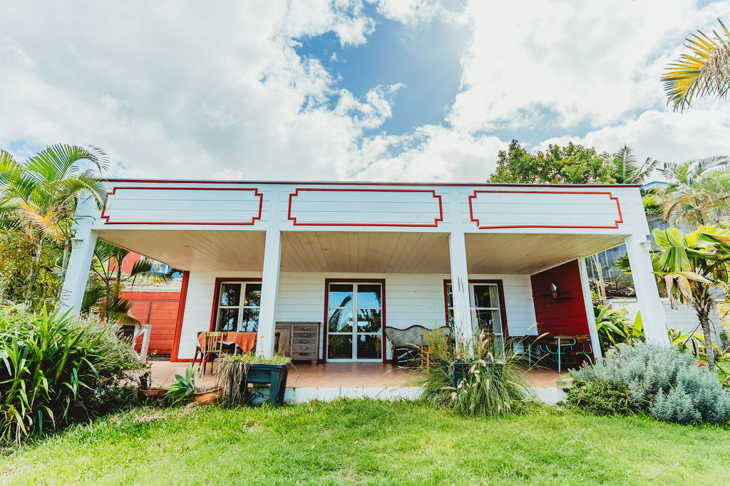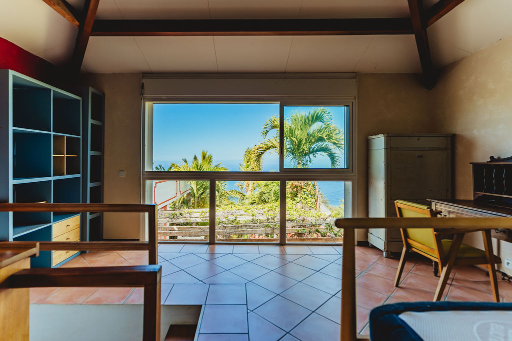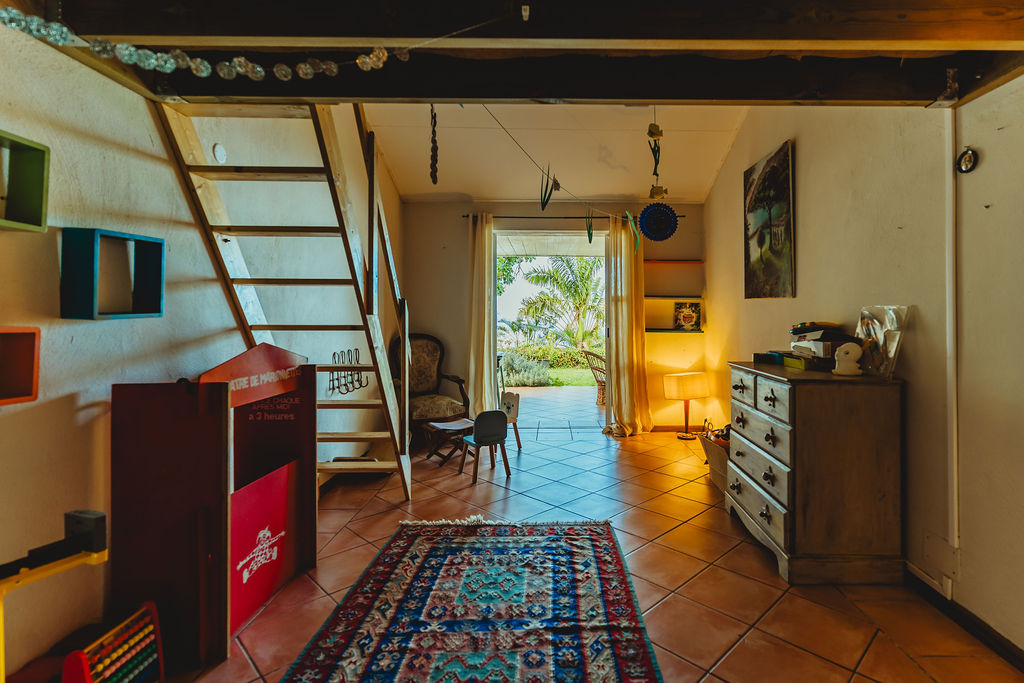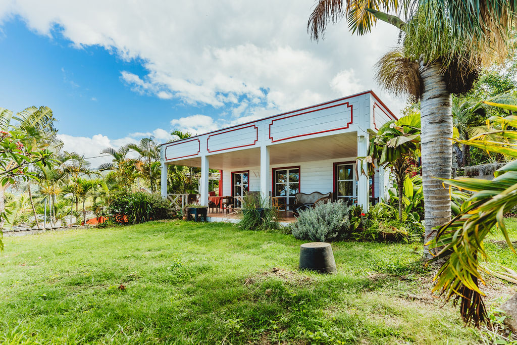Étang-Saint-Leu , à 430 m d’altitude, la maison adopte le style typique créole : structure béton bardée bois, agencement des pièces, charpente apparente, varangue profonde et ouvertures multipliées pour capter brise et lumière. Implantée sur 743 m² de jardin dominant, exposition ouest, elle déroule 147 m² habitables au sol principal + un studio indépendant ~30 m² (ancien garage réaménagé). Compromis entre calme résidentiel et accès : 15 min du centre de Saint-Leu, 25 min de la 4-voies.