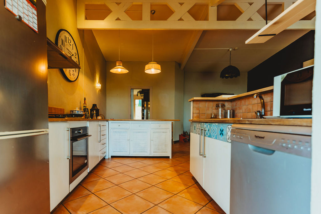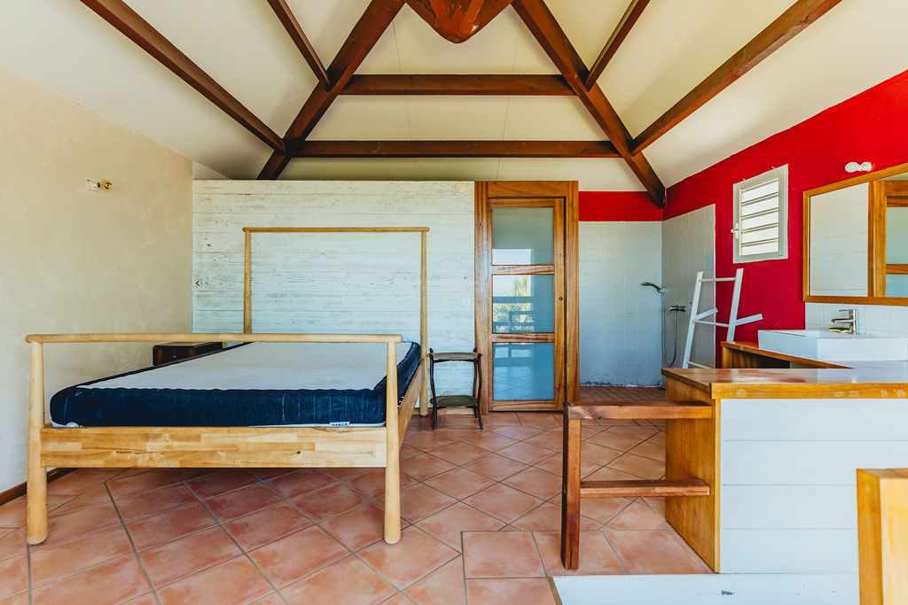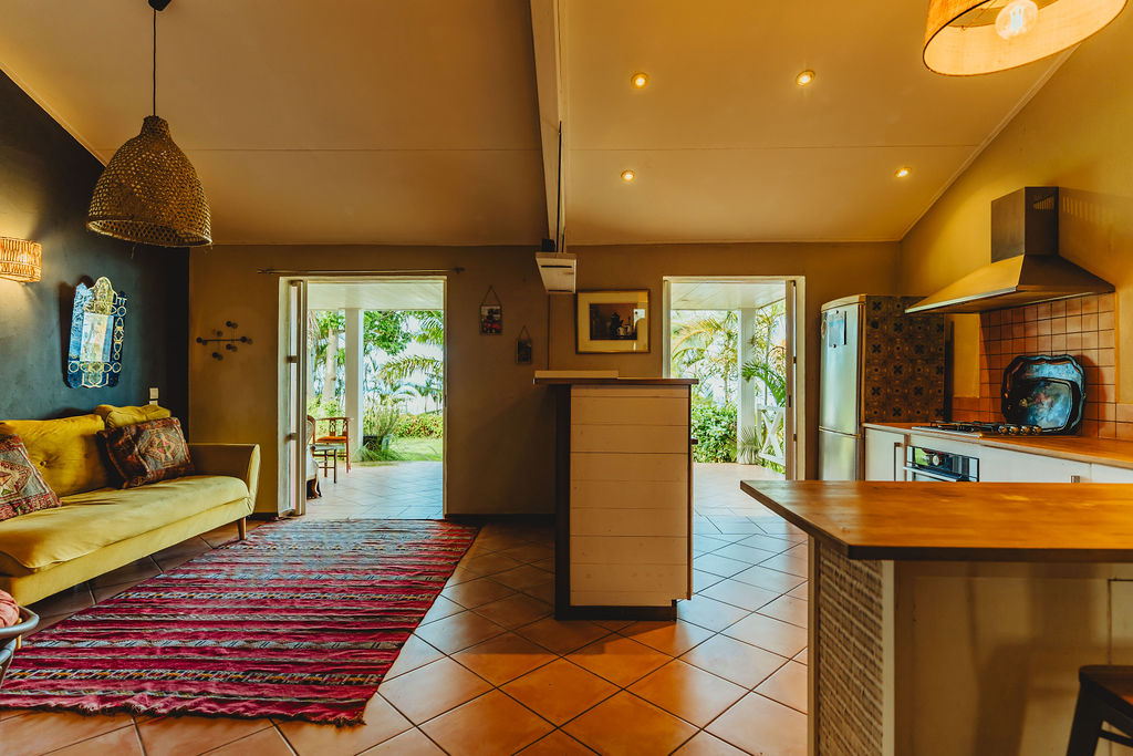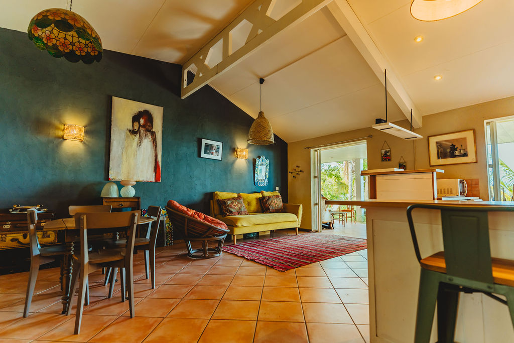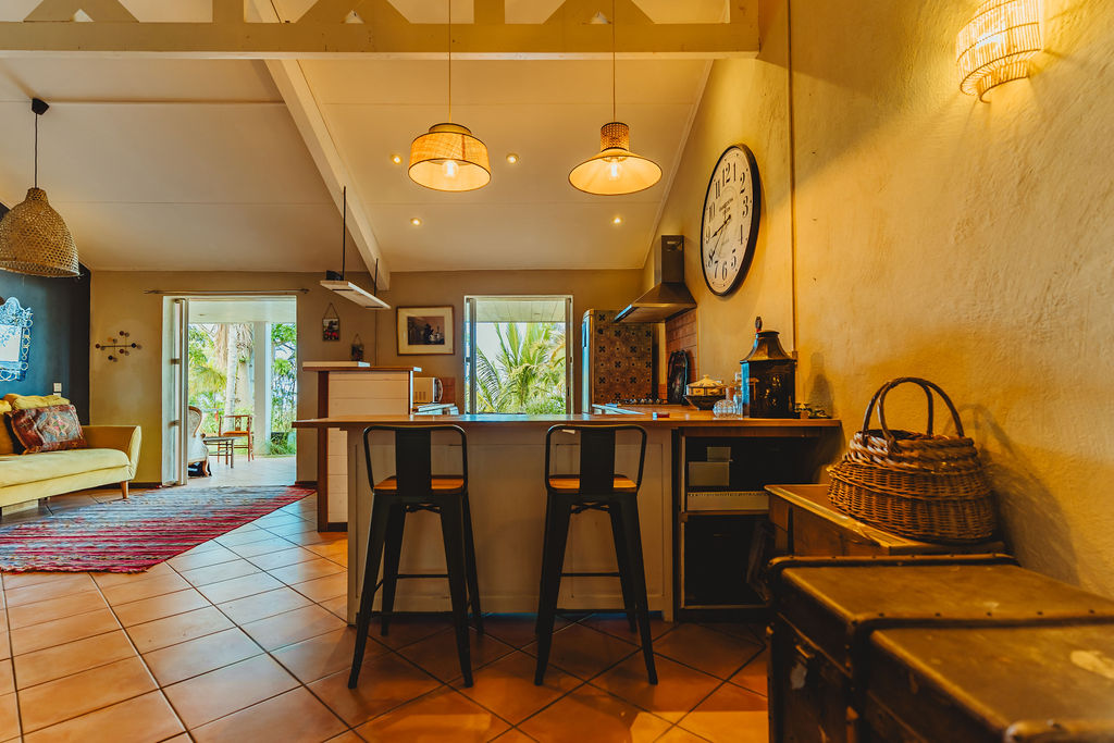Le séjour / cuisine / salle à manger (39 m²) respire sous plafond cathédrale : poutres apparentes, rythme des suspensions, sol chaud et frais facile d’entretien. La cuisine américaine en U avec comptoir cadre l’espace et garde un lien naturel avec la table et le salon pour une vraie vie de pièce unique. Le tout se prolonge de plain-pied vers la varangue couverte (36 m²), salle à manger d’été avec vue mer et jardin tropical. Côté service, une buanderie ouverte sur l’arrière-maison absorbe linge, stockage et retour de plage.