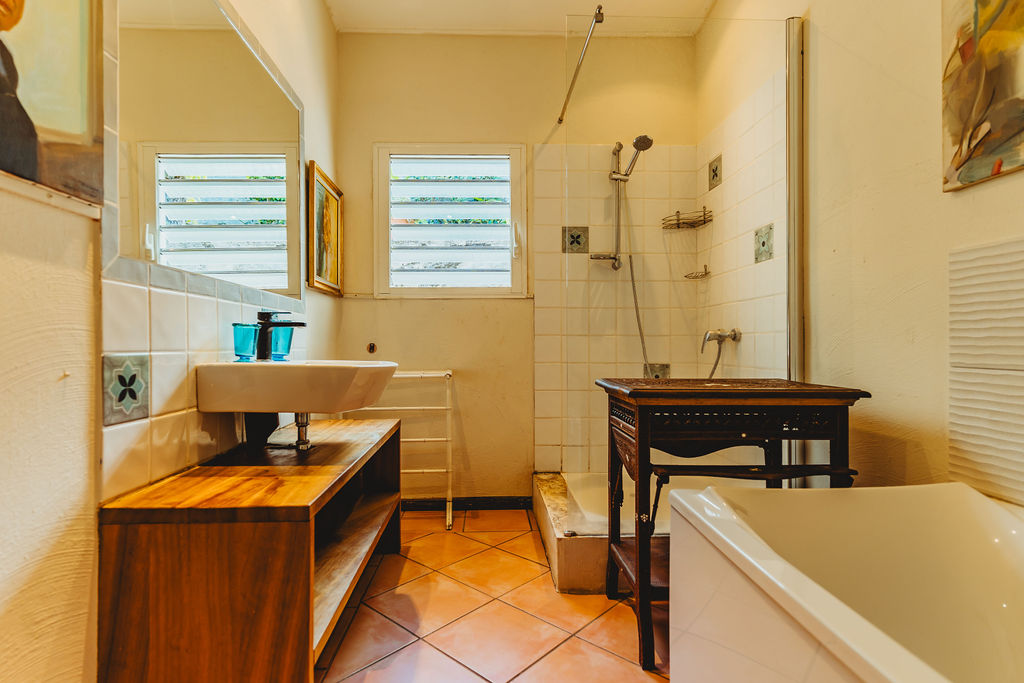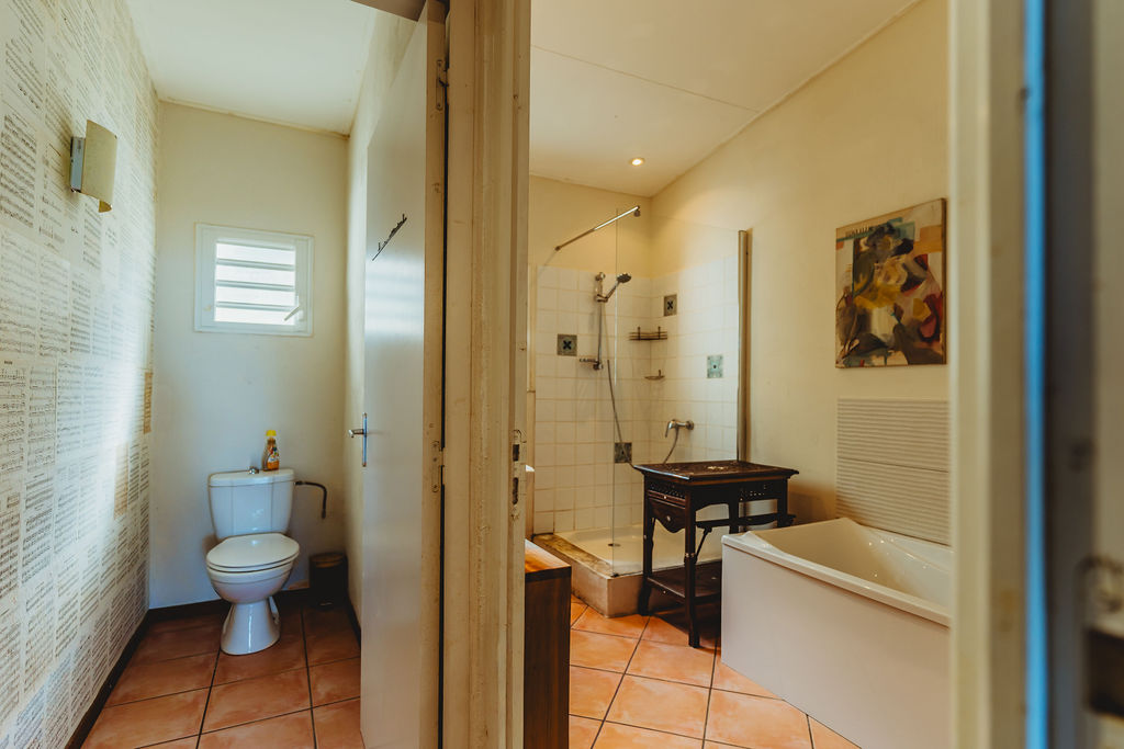 Une grande Salle de bains (baignoire + douche) et WC indépendant complète la fonctionnalité du rez-de-chaussée.