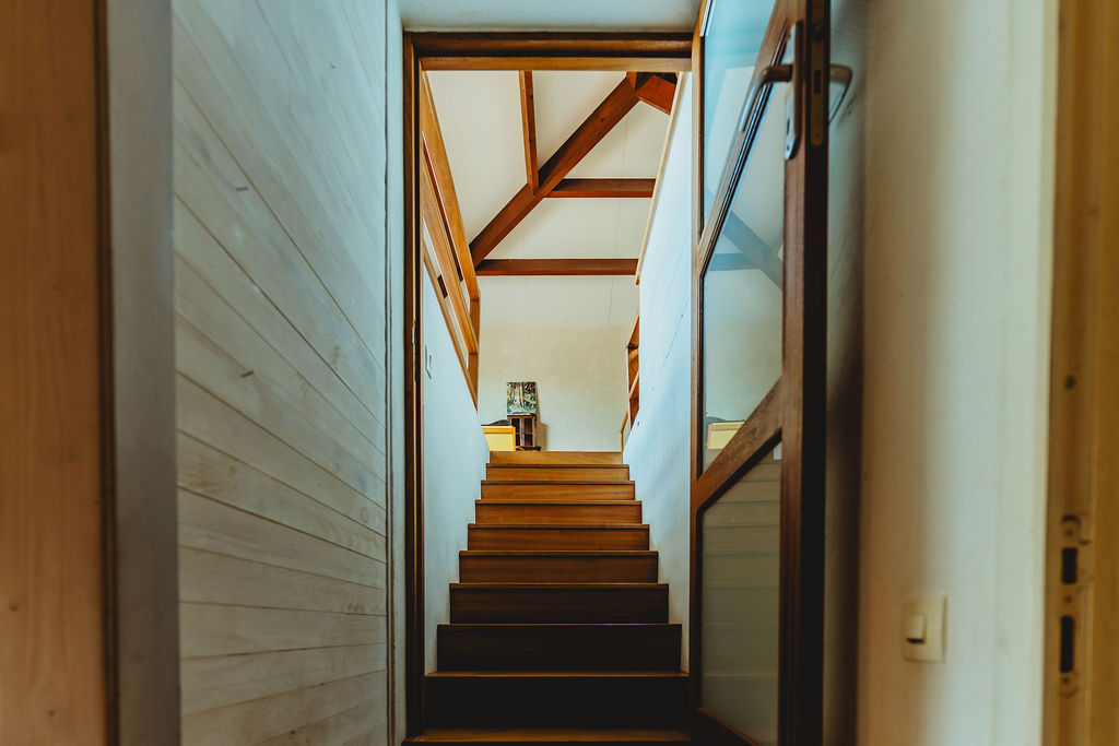 À l’étage, la suite parentale ~30 m² adopte un esprit loft : sous-faîtage, charpente apparente, vaste zone dressing à configurer, baie vitrée cadrant la vue, coin douche intégré. Un volume clair, lisible, propice au calme.