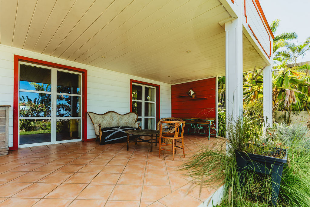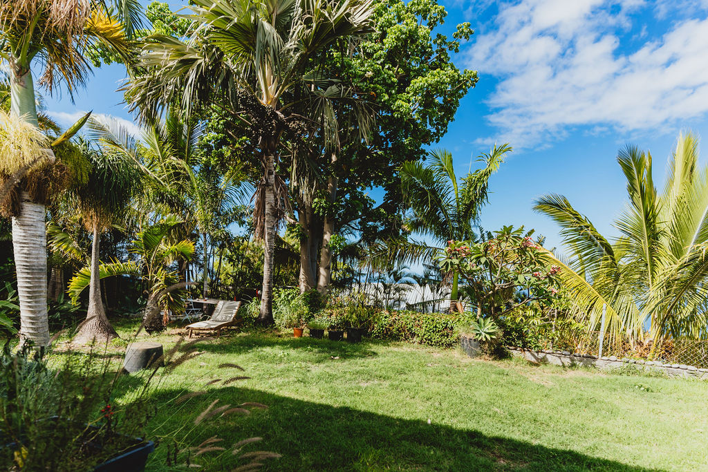 La varangue couverte 36 m² fait office de salle à manger d’été et salon frais. Elle s’ouvre sur un jardin planté (Baobab, palmiers, frangipaniers, massifs) avec vue mer. 3 à 4 places sur la parcelle assurent un stationnement simple.