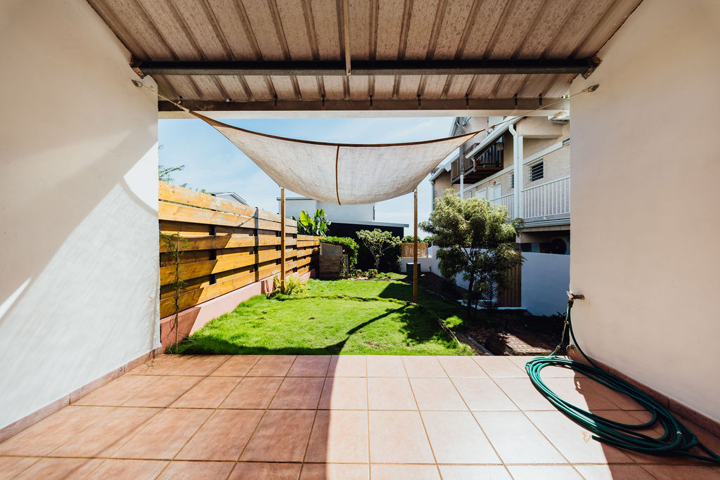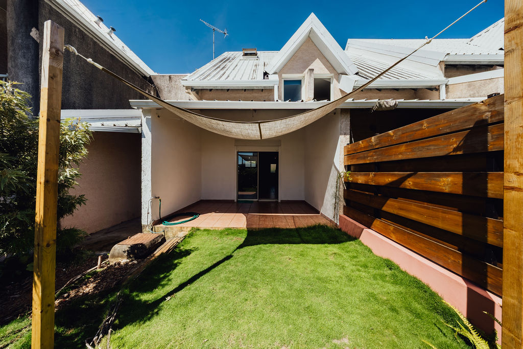 La varangue couverte joue le rôle d’entre-deux climatique : salle à manger d’été, coin lecture ou poste de travail frais. Elle se prolonge par un jardin privatif (~75 m²) paysagé en gazon des Mascareignes, facile d’entretien, fermé par une palissade bois pour la privacy. Un espace de rangement couvert borde la varangue pour l’outillage, les vélos ou le surf. À noter : regard de fosse septique en place (zone non constructible).