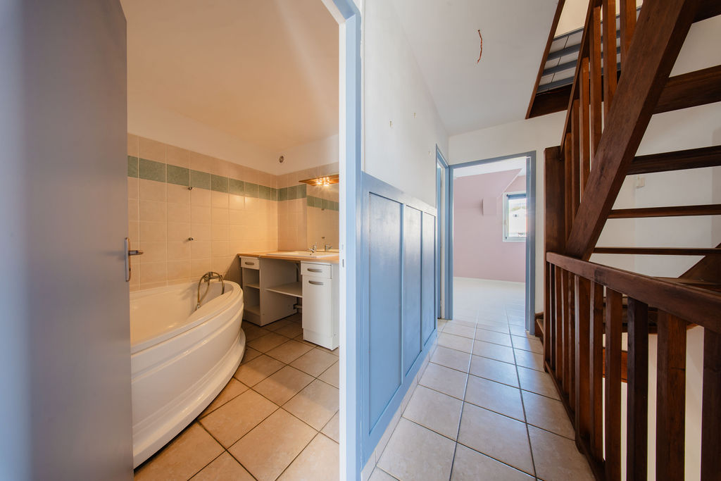 Au 2e niveau, les combles aménagés apportent un supplément de surface : ~16 m² Carrez (pour ~22 m² au sol) sous une belle pente, baignés de lumière grâce au velux. On s’y projette facilement en suite parentale, bureau isolé ou salle de jeux, selon le programme de la famille. Le gabarit, la hauteur et l’éclairement en font une pièce à part entière.