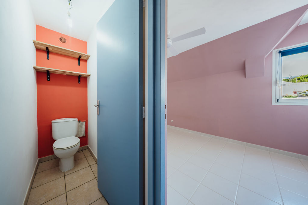 Au 1er étage, deux chambres d’environ 11 m² chacune forment un pôle nuit cohérent. La première regarde la mer, la seconde cadre la montagne et intègre un placard toute hauteur ; toutes deux sont équipées de brasseurs d’air. Une salle de bains et un WC indépendant complètent cet étage, évitent les croisements aux heures de pointe.